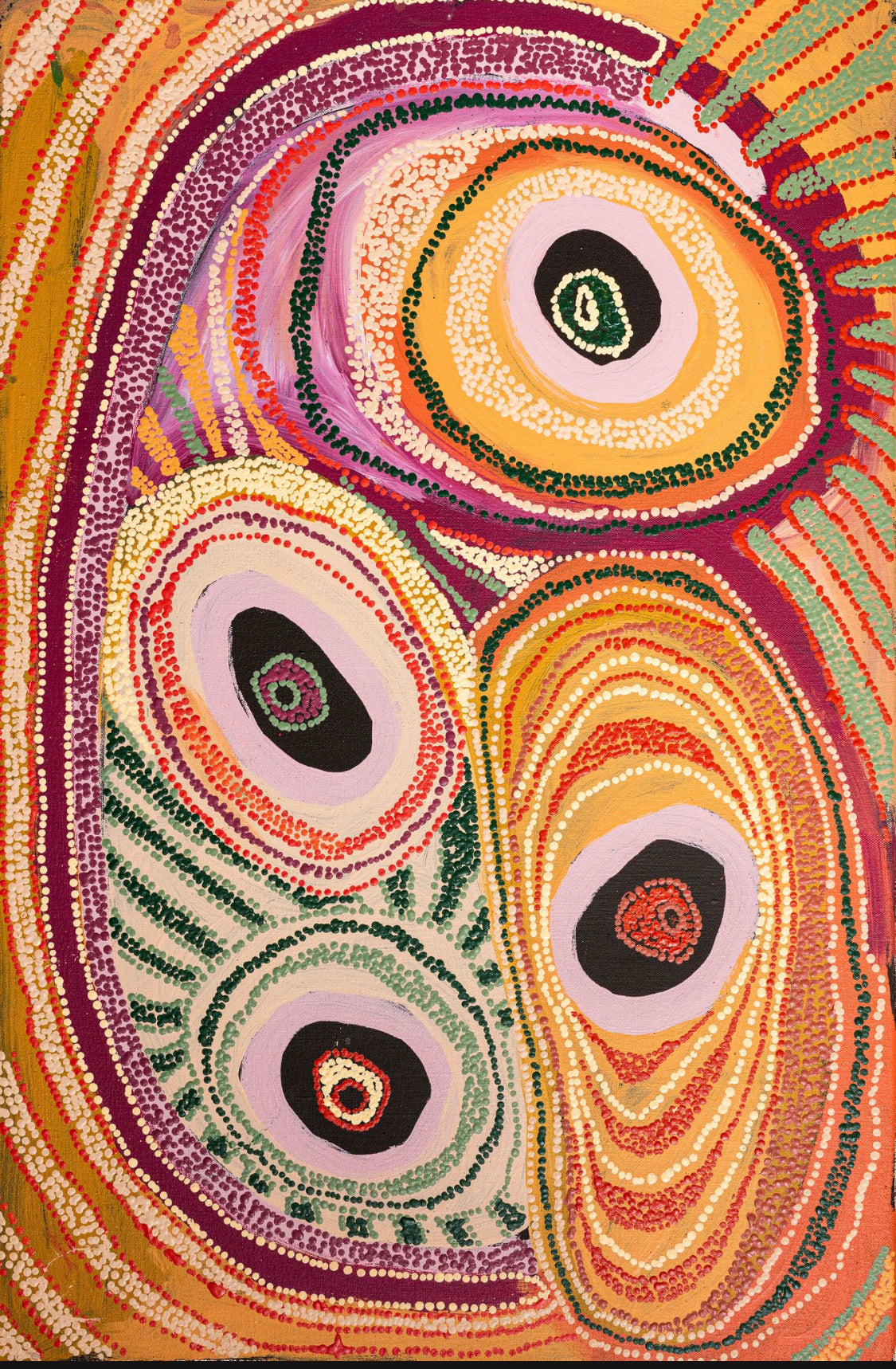 To celebrate my 50th birthday in 2022 my daughter and I hiked the Larapinta Trail through the Tyurrentye landscape of the Arrernte people. The annual Desert Mob exhibition opened the night we returned to Alice Springs.  Corban often paints his grandfathers' country - Kaalpa, Well 23, Canning Stock Route. It was serendipity to meet him and realise he painted my favourite painting. I contacted him later to see if I could use it for this wine and he was happy to be involved, I have paid him for the right to use it.